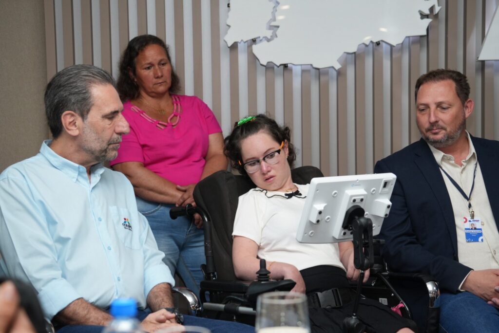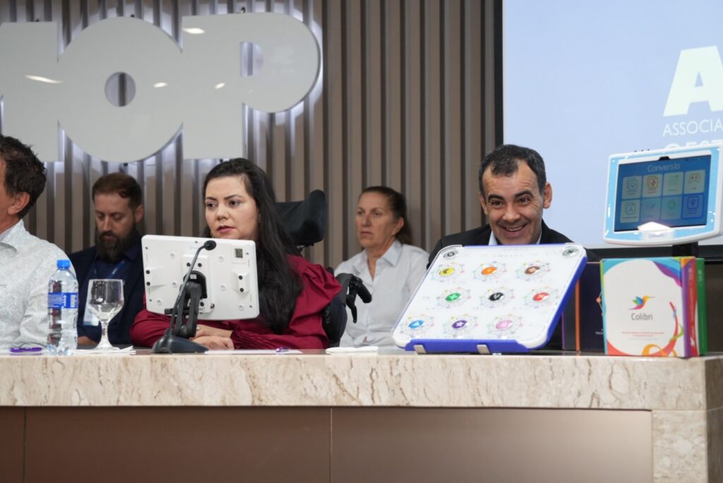 Uma dessas pessoas é a Adriana Mayer, que tem paralisia cerebral e aos 26 anos terá acesso a uma ferramenta que a ajudará a se comunicar por meio da fala. Algo que nunca aconteceu. O sistema, semelhante ao usado pelo físico Stephen Hawking, é uma tecnologia 100% nacional que utiliza o movimento do rosto, como piscadas, por exemplo, para traduzir gestos em palavras. Durante o evento Adriana discursou pela primeira vez com uma voz criada por inteligência artificial. “Hoje estou muito feliz e emocionada por essa conquista. Por meio dessa ferramenta eu vou conseguir conversar com minha família e meus amigos e um dia conseguir me formar e trabalhar como secretária”, disse, agradecendo a Itaipu e a Amop pela possibilidade.