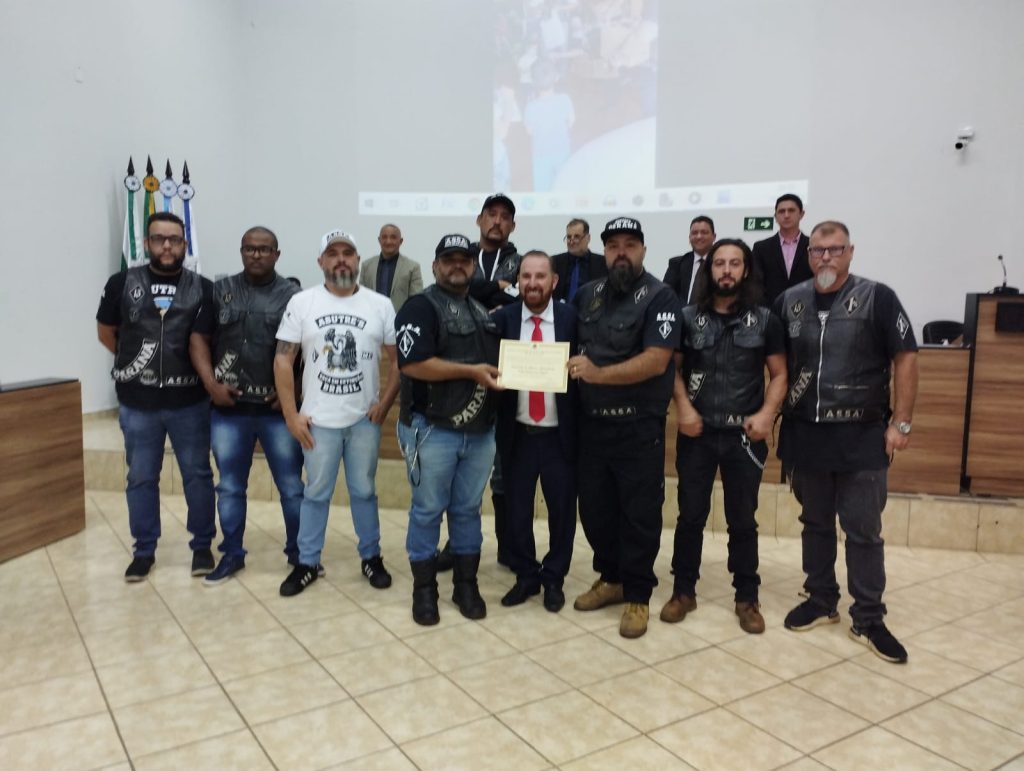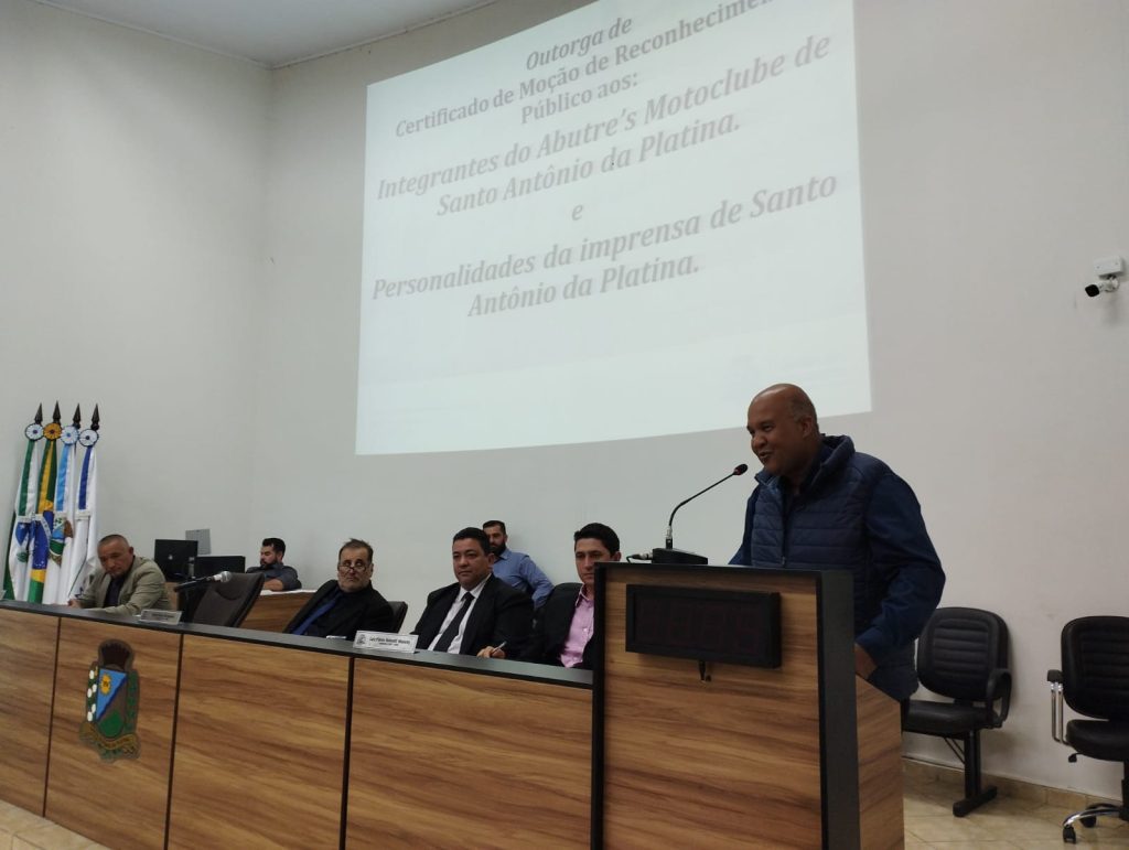 Integrantes do Abrutre’s Moto Clube de Santo Antônio da Platina/PR e profissionais da imprensa local foram homenageados na noite de ontem (24), na Câmara Municipal, com Outorga de Certificado de Moção de Reconhecimento Público proposta pelo vereador Luciano de Almeida Moraes (PTB), o Vermelho.