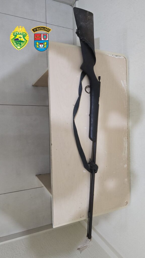Diante disso, os policiais militares foram ao local e encontraram a arma (espingarda). Foram também tomadas as devidas providências para assistência à vítima da violência doméstica.