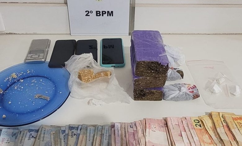 Os policiais realizaram a abordagem e localizaram com o homem uma porção de crack. Em buscas no local onde flagraram o ato, os policiais localizaram diversas porções de maconha e cocaína, além de dinheiro trocado espalhado por toda a parte interna e externa da residência.