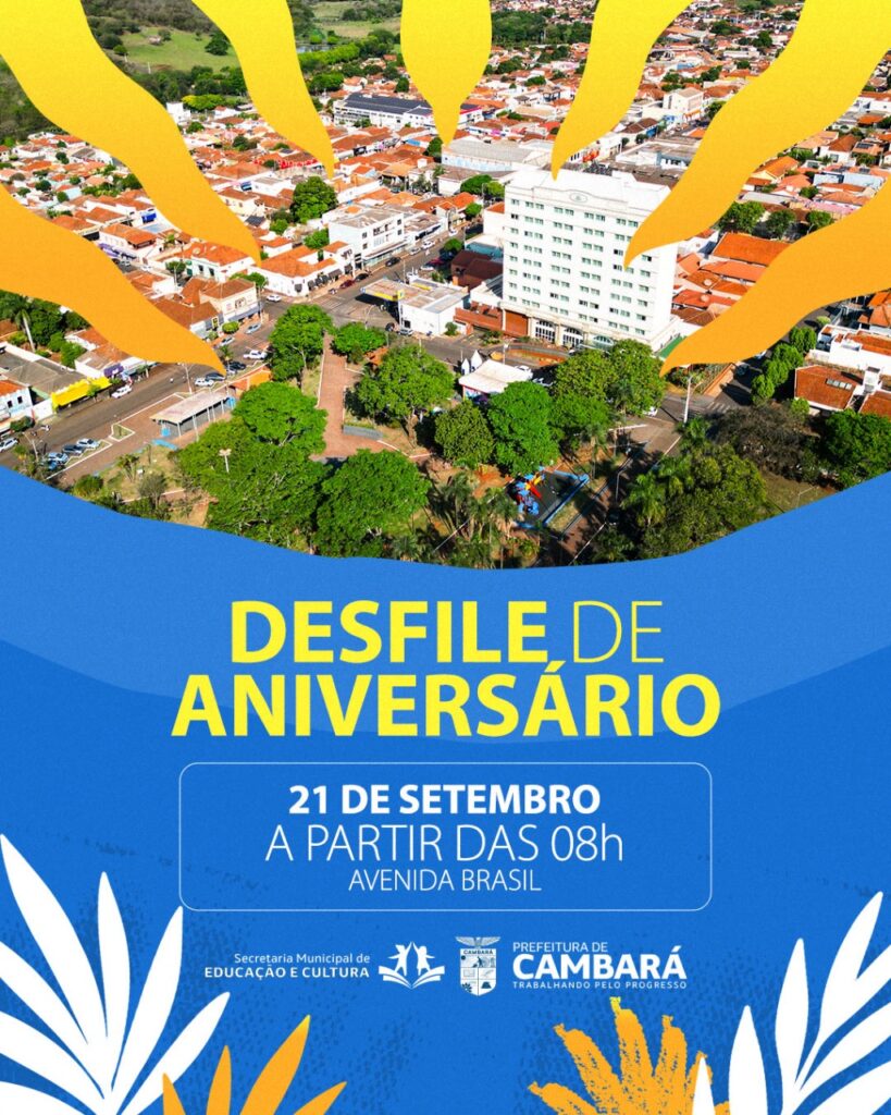 No dia 21 de setembro, a partir das 08h, a Avenida Brasil será palco de um espetáculo que celebra a história, cultura e identidade de Cambará e seu povo. O tema deste ano, “Projetos em Festa: Viagem pelas Histórias”, promete encantar com apresentações de escolas, instituições, entidades, clubes de serviço, forças de segurança e grupos da comunidade. Entre as participações confirmadas: Tiro de Guerra, Defesa Civil, Guarda Municipal, Mensageiros de Luz – APAE, CMEIs, Escolas Municipais e Estaduais, colônias e projetos culturais, clubes de serviço, grupos esportivos, paróquias, carros antigos, cavalgada e muito mais!