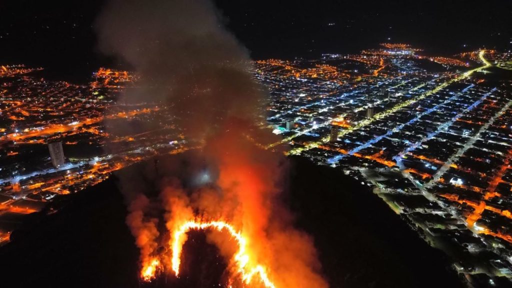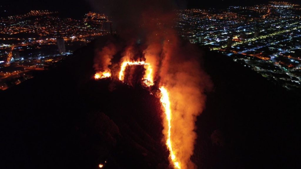 Na noite de domingo (6), um incêndio de grandes proporções atingiu uma área de vegetação, predominantemente composta por pastagem, no Morro do Bim, em Santo Antônio da Platina/PR. O fogo se alastrou rapidamente, criando uma linha de chamas que se estendia desde a base até o pico do morro, agravando a situação devido ao terreno de difícil acesso.