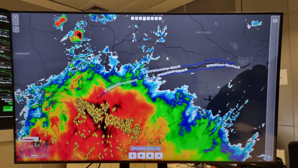 O setor de Despacho de Carga da Itaipu (DC-IPU), responsável por decisões importantes na operação da usina e dos sistemas elétricos do Brasil e do Paraguai, passou a contar com um painel de monitoramento meteorológico em tempo real. O recurso exibe imagens de satélite, radar e incidência de raios nas áreas de interesse da Binacional e das principais linhas de transmissão de energia nos dois países. Isso permite acompanhar a formação e o desenvolvimento de eventos meteorológicos nos sistemas utilizados para escoar a produção de eletricidade.