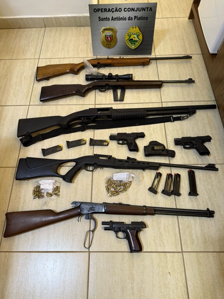 Na manhã desta terça-feira (01/04) foi deflagrada operação conjunta da Polícia Civil e Polícia Militar para cumprimento de mandados de busca domiciliar em alvos que estariam em posse ilegal de armas de fogo na cidade de Santo Antônio da Platina.