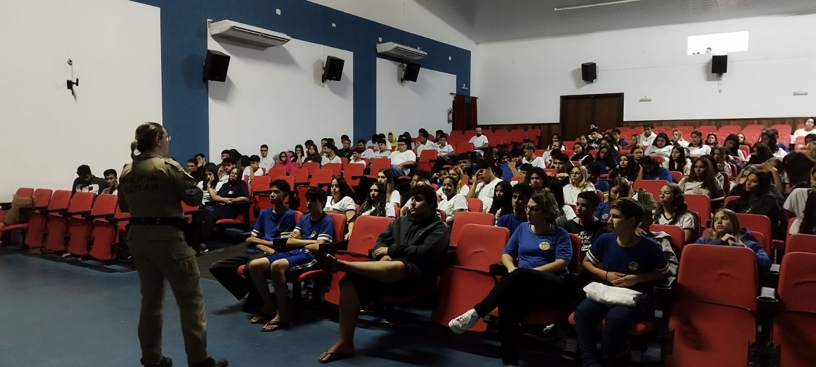 Nesta segunda (25), policiais da equipe Patrulha Maria da Penha do 2º BPM realizaram palestras para os alunos do Colégio Hermínia Lupion em Ribeirão do Pinhal.