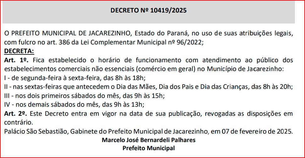A Prefeitura de Jacarezinho publicou nesta sexta-feira (7) o Decreto nº 10.419/2025, que define novos horários de funcionamento para os estabelecimentos comerciais não essenciais da cidade.