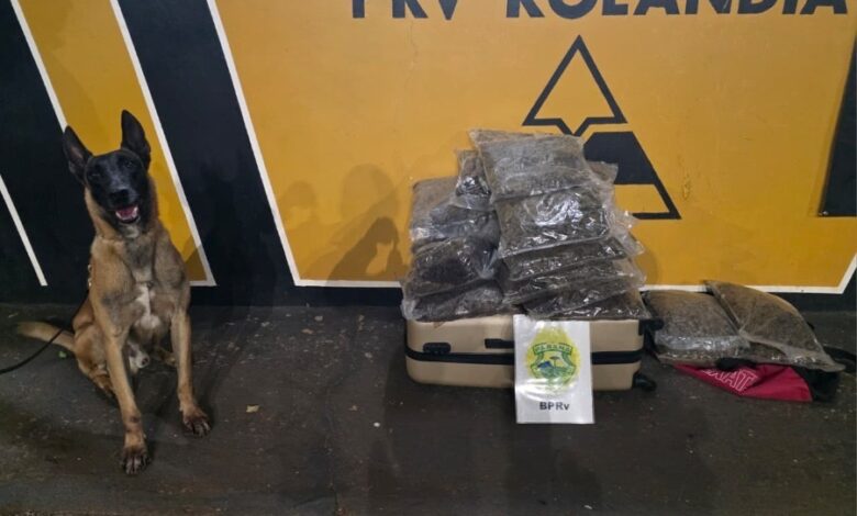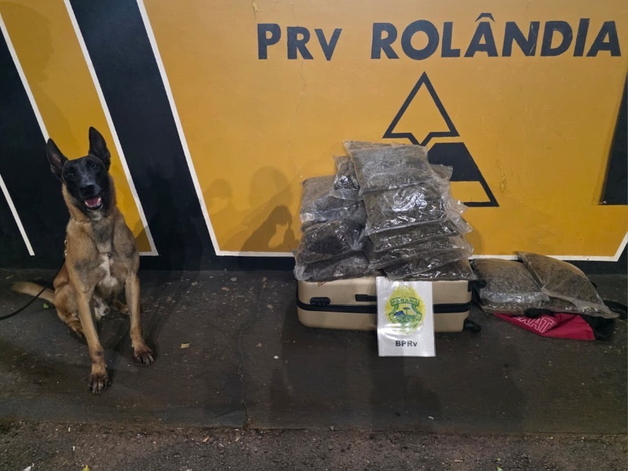 O canil da 2ª Companhia da Polícia Rodoviária Estadual (BPRv), com sede em Jacarezinho, apreendeu 17,4 quilos de maconha do tipo morruga durante operação realizada nesta terça-feira (30) em Rolândia. Uma passageira de 27 anos foi presa em flagrante.