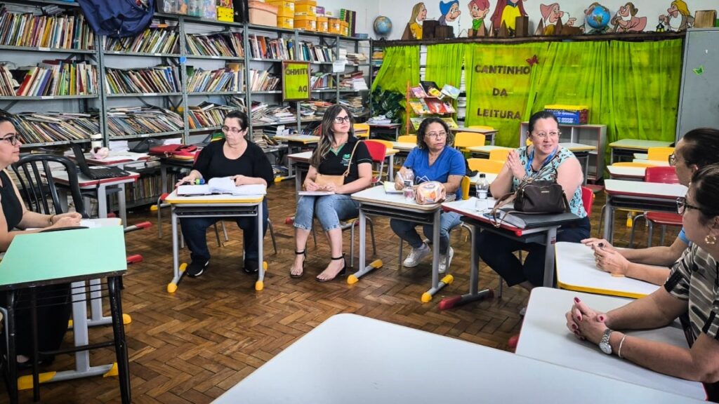 Nesta etapa, o encontro foi realizado com a equipe da Escola Municipal Pingo de Gente, dando continuidade às ações já desenvolvidas na Escola Municipal do Campo Arco-Íris, no Distrito Nossa Senhora Aparecida, e em reuniões com gestores e professores no auditório da Secretaria.