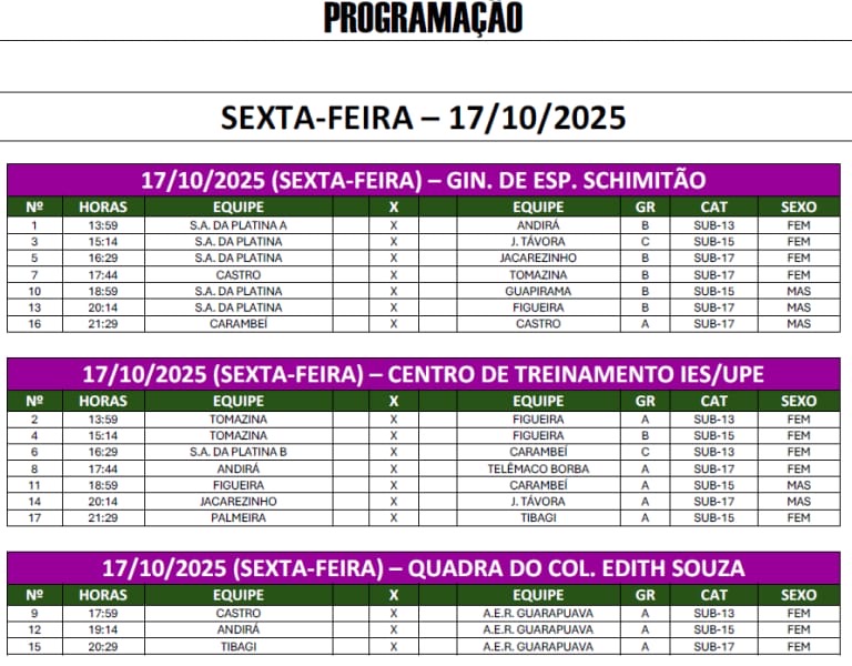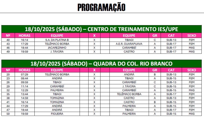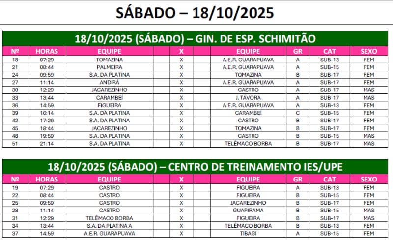 As competições começam na tarde desta sexta e reúnem esportistas das modalidades Sub-13, Sub-15 e Sub-17, Masculino e Feminino, representando 13 municípios: A.E.R. Guarapuava, Andirá, Carambeí, Castro, Figueira, Guapirama, Jacarezinho, Joaquim Távora, Palmeira, Telêmaco Borba, Tibagi, Tomazina e o anfitrião Santo Antônio da Platina.