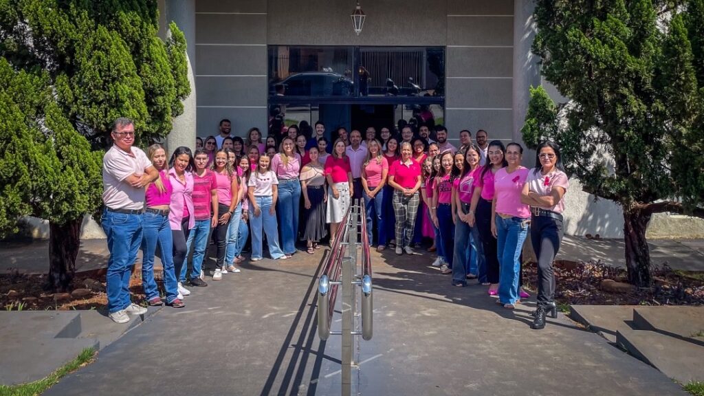 Reunidos em frente ao Paço Municipal “Braulio Barbosa Ferreira”, os colaboradores vestiram rosa para reforçar a importância dos cuidados com a saúde e do incentivo à realização de exames preventivos, como a mamografia e o autoexame das mamas