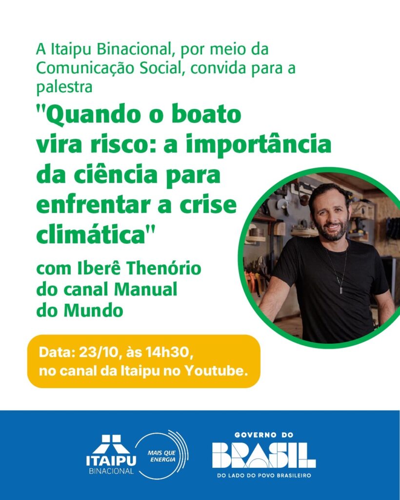 O divulgador científico e apresentador do canal Manual do Mundo, Iberê Thenório, fará uma palestra virtual pelo canal da Itaipu no Youtube na próxima quinta-feira (23), às 14h30. O tema do webinar será “Quando o boato vira risco: a importância da ciência para enfrentar a crise climática”.