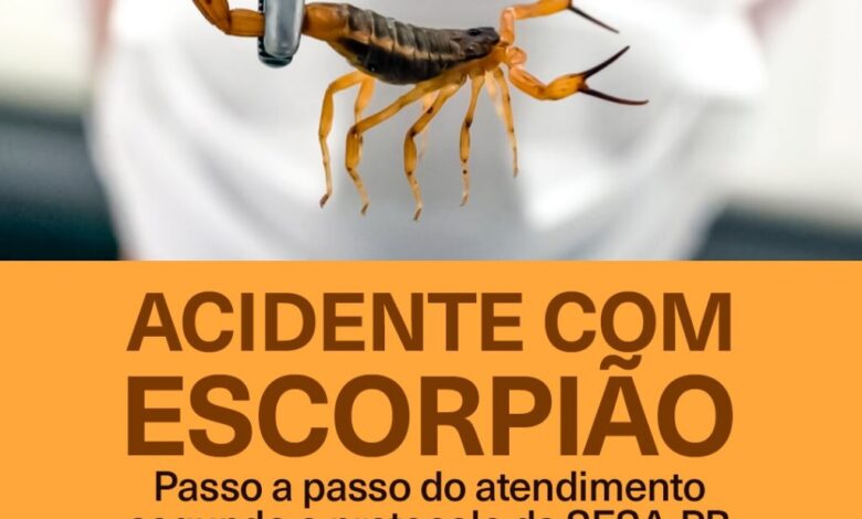 “Conforme o protocolo da Secretaria de Estado da Saúde do Paraná (SESA/PR), todo caso provável ou confirmado de acidente escorpiônico deve ser notificado imediatamente e encaminhado para avaliação médica”.