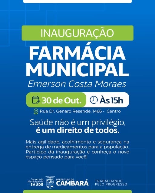 A Prefeitura Municipal de Cambará inaugura, nesta quinta-feira (30 de outubro), às 15h, a nova Farmácia Municipal, localizada na Rua Dr. Genaro Resende, 1466.