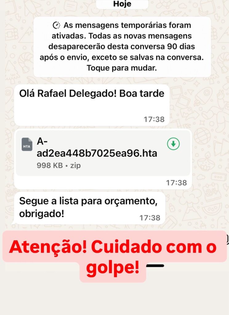 Os delegados alertam: Não clique nesse arquivo. É um vírus que irá fazer com que essa mensagem e arquivo seja encaminhada para toda sua lista de contatos do WhatsApp e poderá instalar um programa no seu aparelho celular que permitirá que golpistas acessem os seus dados, em especial pode permitir acesso aos aplicativos bancários.