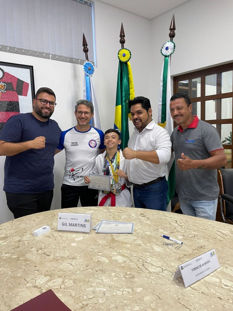 O atleta Júlio Borba, conhecido como Julinho do Taekwondo, foi homenageado nesta quinta-feira (30) no Gabinete do Prefeito Gil Martins, em Santo Antônio da Platina. A cerimônia contou também com a presença do secretário municipal de Esportes, Diego Vieira, que destacou o destaque do atleta durante o ano.