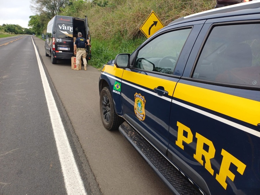 Indagado, o condutor informou que realizava o transporte de cigarros contrabandeados, o que foi confirmado em vistoria no compartimento de carga, que estava lotado.