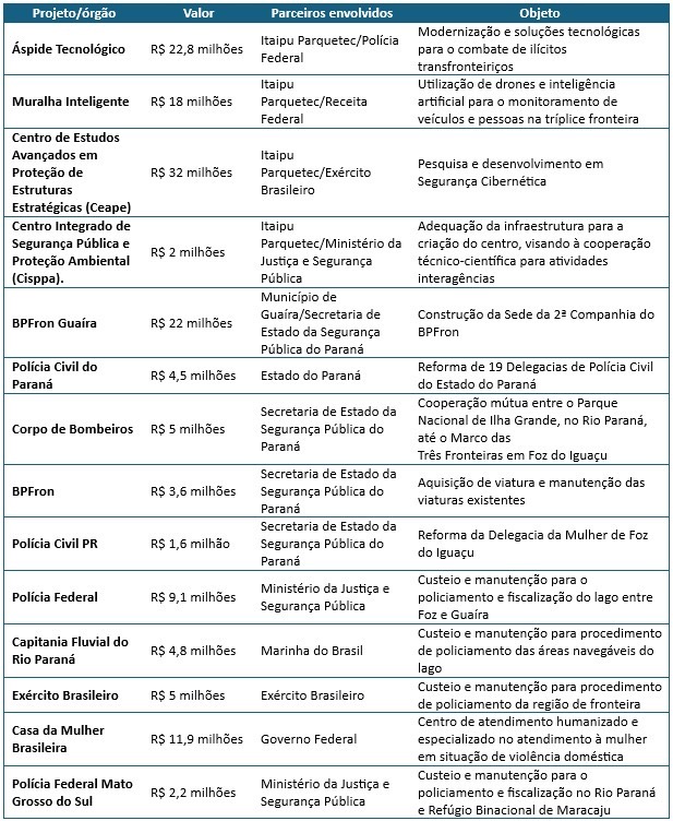Este investimento da Itaipu integra uma série de outras ações que somam aproximadamente R$ 170 milhões em equipamentos, serviços, pesquisas e inteligência para a segurança pública na região. “A Itaipu colabora de longa data com as forças de segurança na fronteira. Investe em equipamentos e inteligência para cuidar da sua área de interesse e contribuir com a segurança dos cidadãos. Assim, cumprimos o papel que é dado pelo presidente Lula na ajuda ao combate de ilícitos e diminuição da criminalidade no entorno do reservatório”, destaca o diretor-geral brasileiro da Itaipu, Enio Verri.