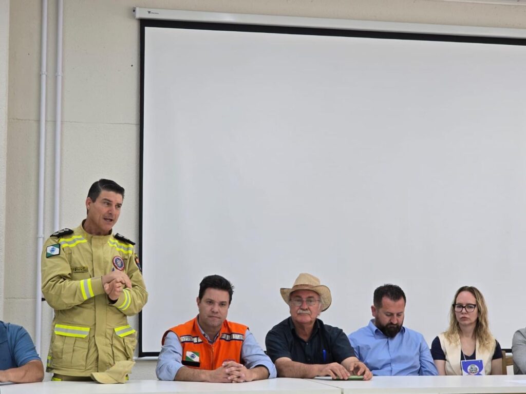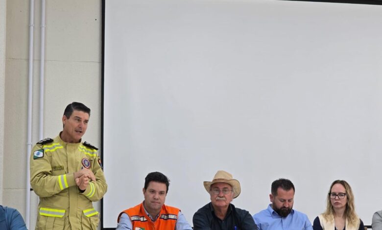 Legenda: Secretário das Cidades, Guto Silva, em reunião com representantes de órgãos estaduais e voluntários nesta terça-feira (11) em Rio Bonito do Iguaçu.