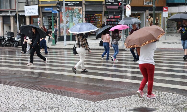 No domingo, a frente fria avança mais devagar pelo território paranaense e a chuva se espalha para todas as regiões. As temperaturas caem de maneira significativa, exceto no Norte, onde o abafamento persiste.