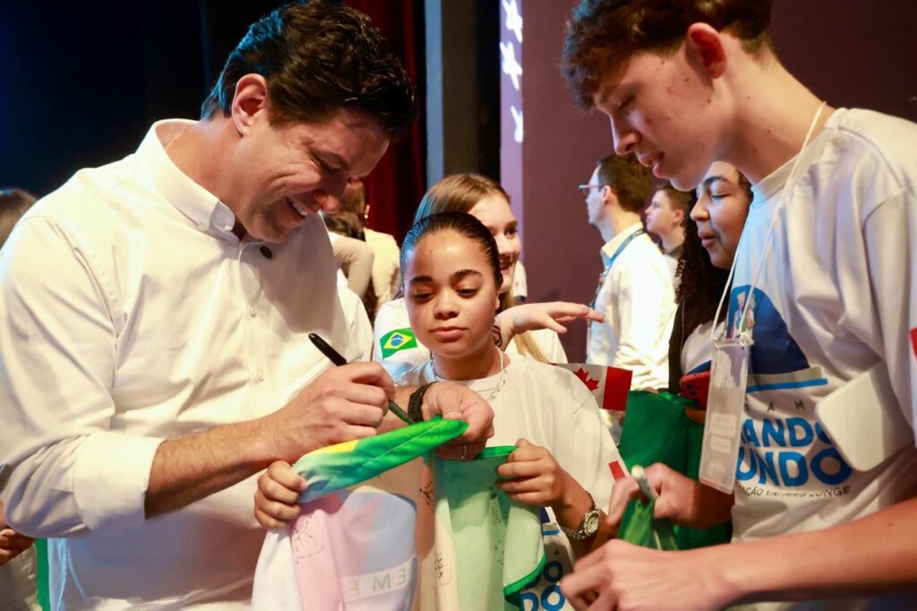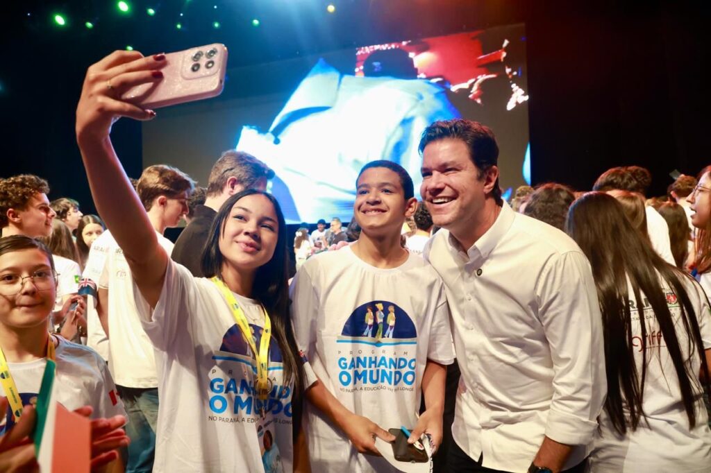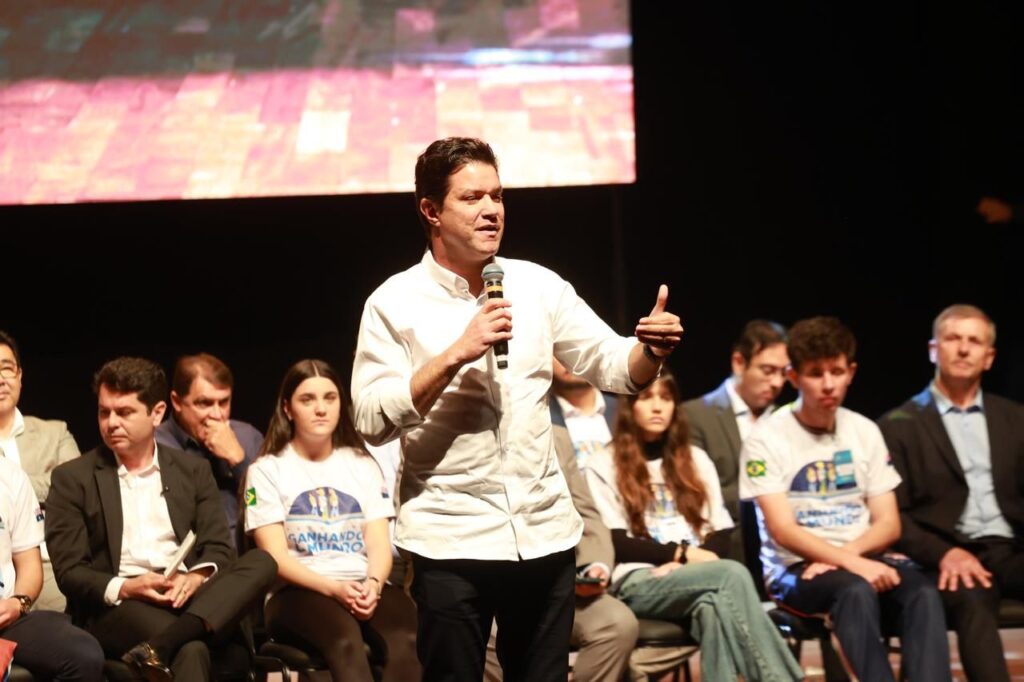 O secretário estadual das Cidades, Guto Silva, participou nesta terça-feira (25), ao lado do governador Carlos Massa Ratinho Junior, do encontro do Projeto Ganhando o Mundo no Teatro Guaíra, em Curitiba. O evento reuniu estudantes que integram a maior edição do programa de intercâmbio estudantil, que em 2026 levará 2 mil jovens para Canadá, Irlanda, Nova Zelândia, Reino Unido e Austrália.