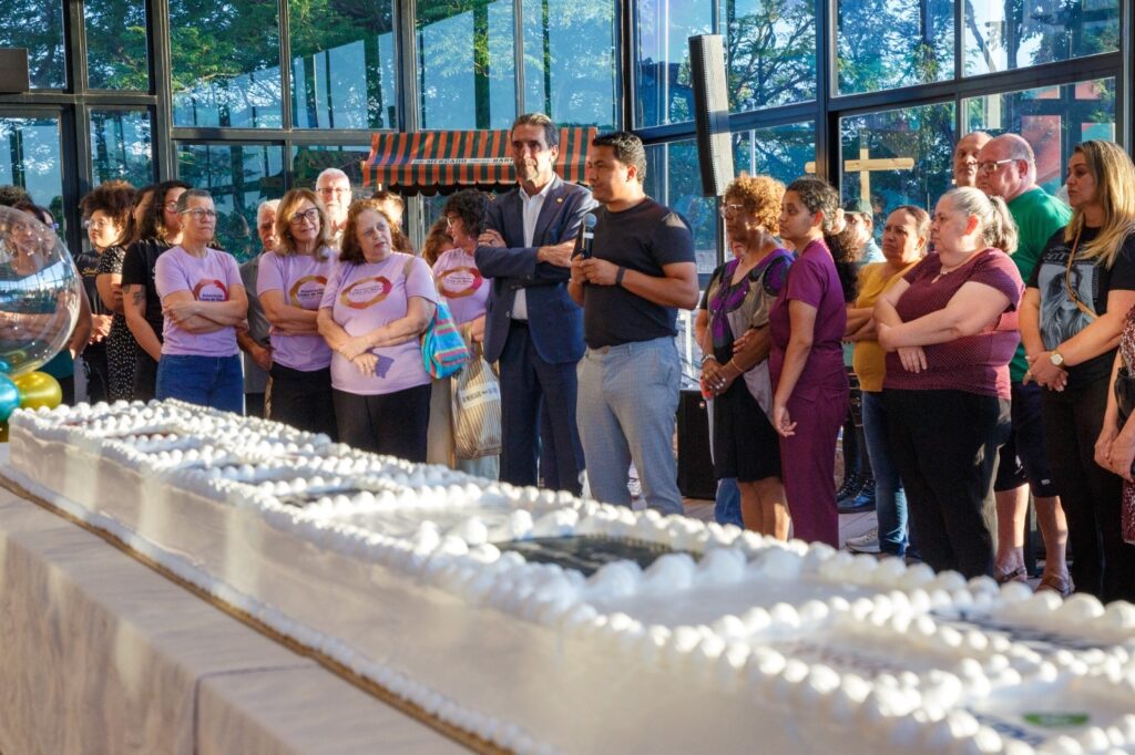 Em seguida, os participantes celebraram o aniversário com o “parabéns pra você” e um gigantesco bolo que trazia a inscrição da logo de cada comércio que compõe o Mercado Barrageiro.
