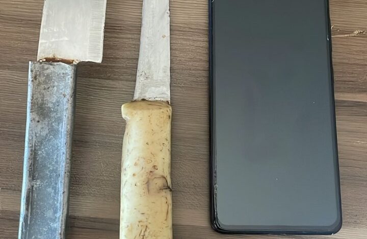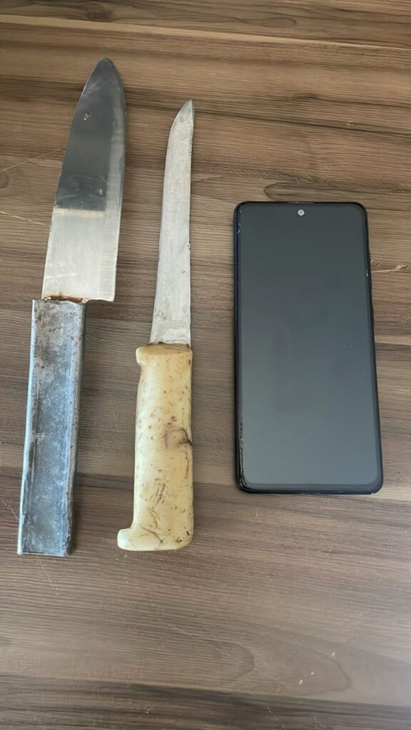 A vítima relatou ter sido agredida por três indivíduos armados com facas, que posteriormente subtraíram seu aparelho celular. Após patrulhamento, a equipe policial obteve êxito em localizar dois dos envolvidos. Durante a abordagem, o celular roubado foi encontrado escondido sobre um muro próximo ao local.