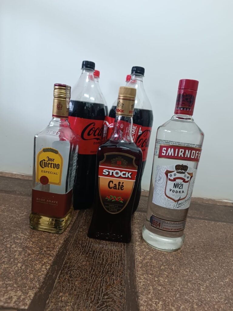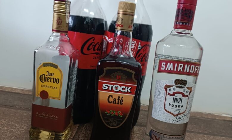 No local, foram recuperados quatro garrafas de refrigerante, uma de vodca, uma de licor e uma de tequila