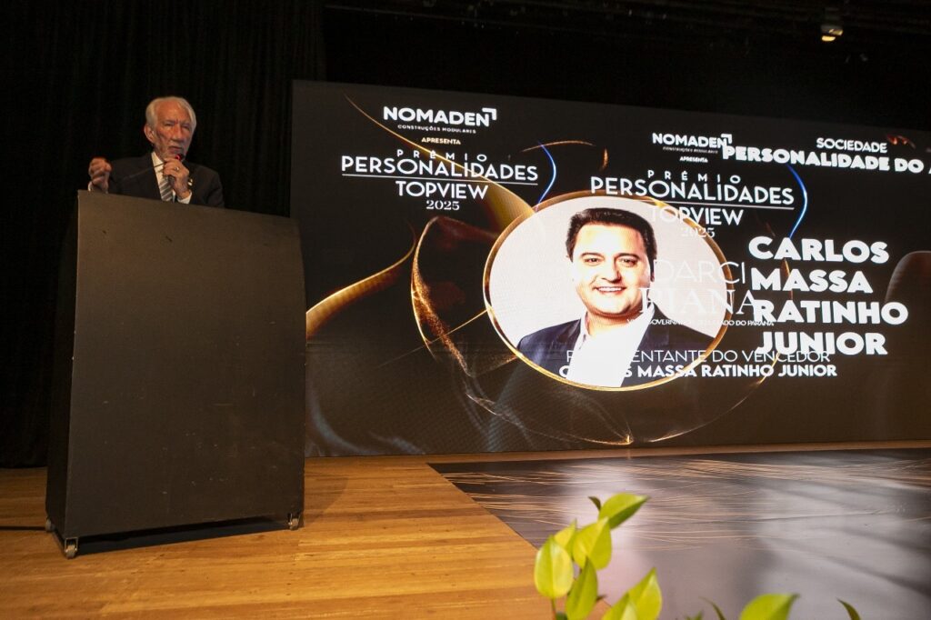 O governador Carlos Massa Ratinho Junior foi eleito a Personalidade do Ano pelo Prêmio TOPVIEW Personalidades 2025. A cerimônia de entrega ocorreu na noite da última terça-feira (9), no Museu Oscar Niemeyer, em Curitiba. Representando o chefe do Executivo estadual, o vice-governador Darci Piana subiu ao palco para receber o Troféu Mário Petrelli, símbolo da premiação criada pelo artista argentino radicado no Brasil, Alfi Vivern.