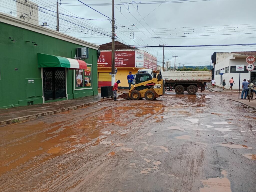 Logo cedo, caminhão e maquinário da prefeitura estava na rua Deputado Benedito Lucio Machado – próximo à Loja Bordgnon, retirando o excesso de barro e entulhos trazidos pelas águas das chuvas.