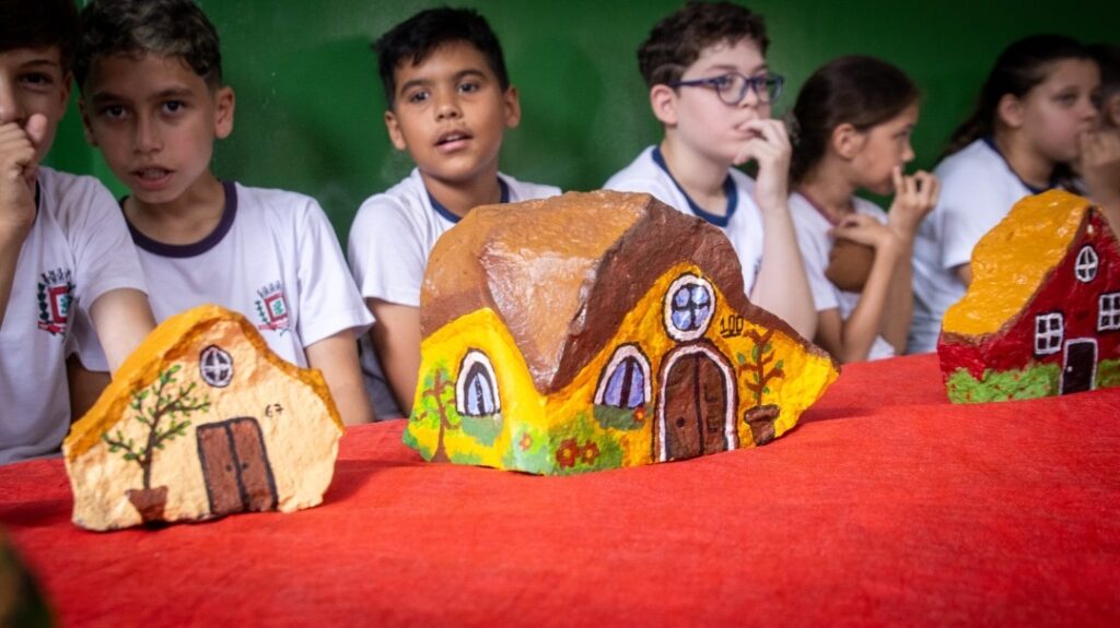 Os alunos produziram pinturas em pedras, criando peças artísticas muito bonitas, cheias de personalidade e delicadeza. De acordo com as professoras, a metodologia foi apresentada em várias etapas: primeiro, o contato com o tema em sala de aula; depois, o apoio de uma importante artista da comunidade, Crislene de Cássia Paschoalino, que atua há muitos anos na pintura em pedra Zebra Poá e trouxe suas orientações para os alunos. Eles também foram até a pedreira da cidade, onde escolheram as pedras e, posteriormente, fizeram a limpeza, com técnicas específicas adquiridas na orientação concedida pela artista. O próximo passo foi a pintura, produzindo representações de casas, animais e outros elementos da natureza, sempre associando estratégias de pintura e os diálogos sobre a tema.