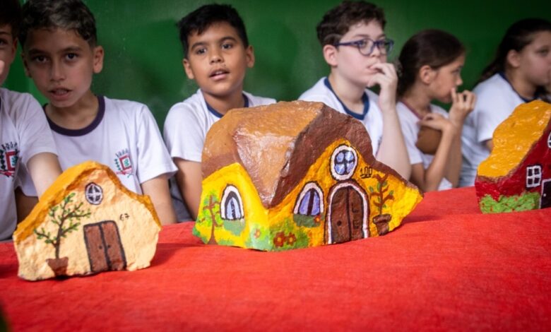 Os alunos produziram pinturas em pedras, criando peças artísticas muito bonitas, cheias de personalidade e delicadeza. De acordo com as professoras, a metodologia foi apresentada em várias etapas: primeiro, o contato com o tema em sala de aula; depois, o apoio de uma importante artista da comunidade, Crislene de Cássia Paschoalino, que atua há muitos anos na pintura em pedra Zebra Poá e trouxe suas orientações para os alunos. Eles também foram até a pedreira da cidade, onde escolheram as pedras e, posteriormente, fizeram a limpeza, com técnicas específicas adquiridas na orientação concedida pela artista. O próximo passo foi a pintura, produzindo representações de casas, animais e outros elementos da natureza, sempre associando estratégias de pintura e os diálogos sobre a tema.