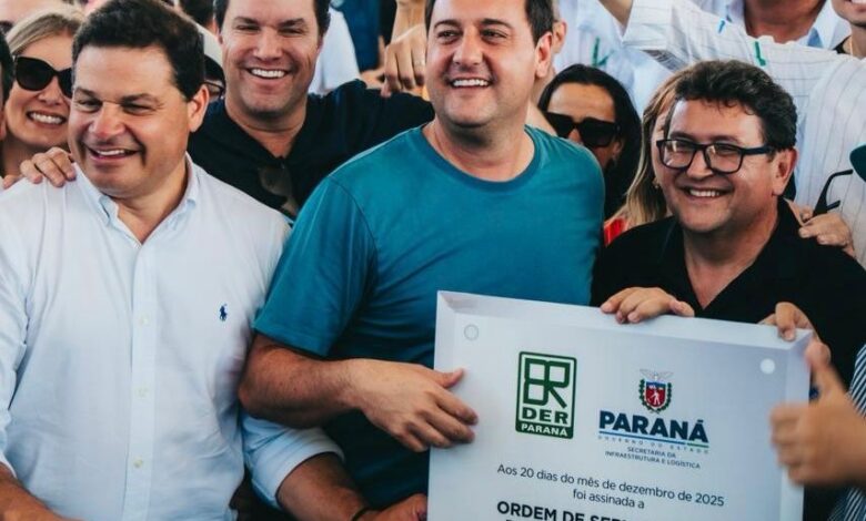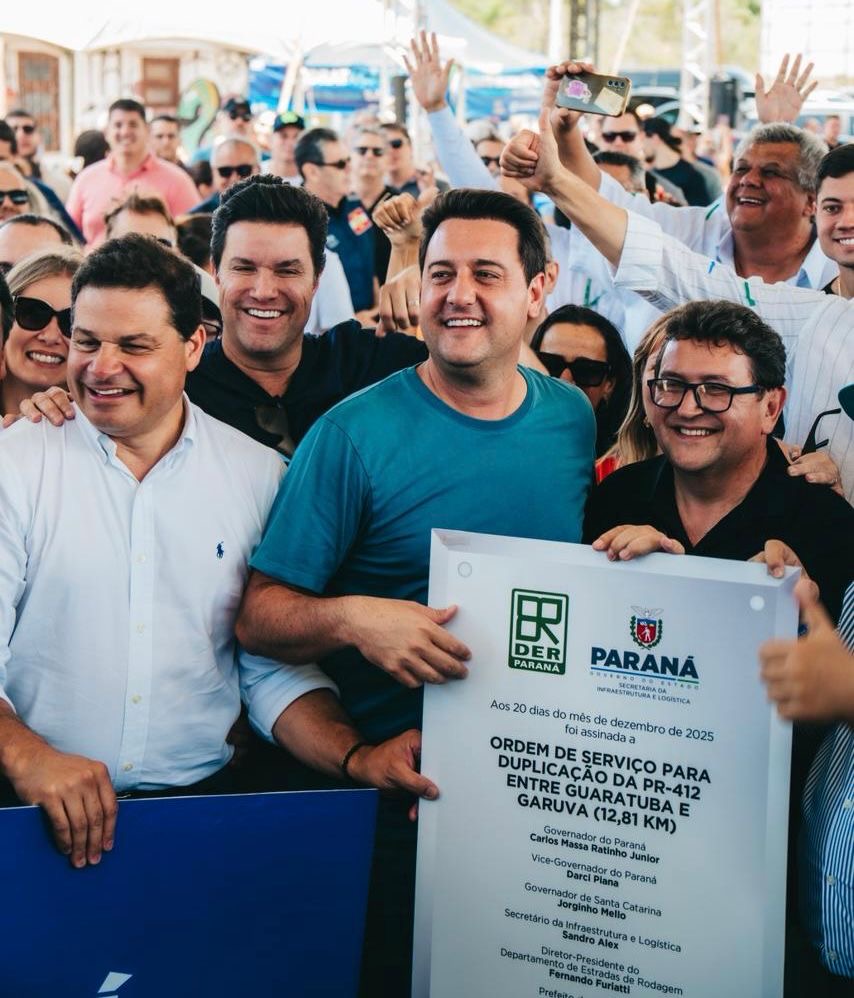 O Governo do Estado assinou, neste sábado (20), em Guaratuba, a ordem de serviço para a duplicação da PR-412, no trecho entre Guaratuba, no Litoral do Paraná, e Garuva, em Santa Catarina. A cerimônia contou com a presença do governador Carlos Massa Ratinho Junior e do secretário estadual das Cidades, Guto Silva.