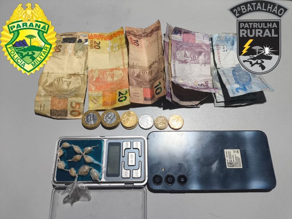 Segundo a Polícia Militar, equipes de patrulha rural realizavam abordagens preventivas na região do evento quando perceberam um indivíduo em atitude suspeita e decidiram realizar a abordagem. Durante a revista pessoal, os policiais localizaram substância análoga ao crack, fracionada e embalada de forma característica para comercialização, além de dinheiro em notas diversas.