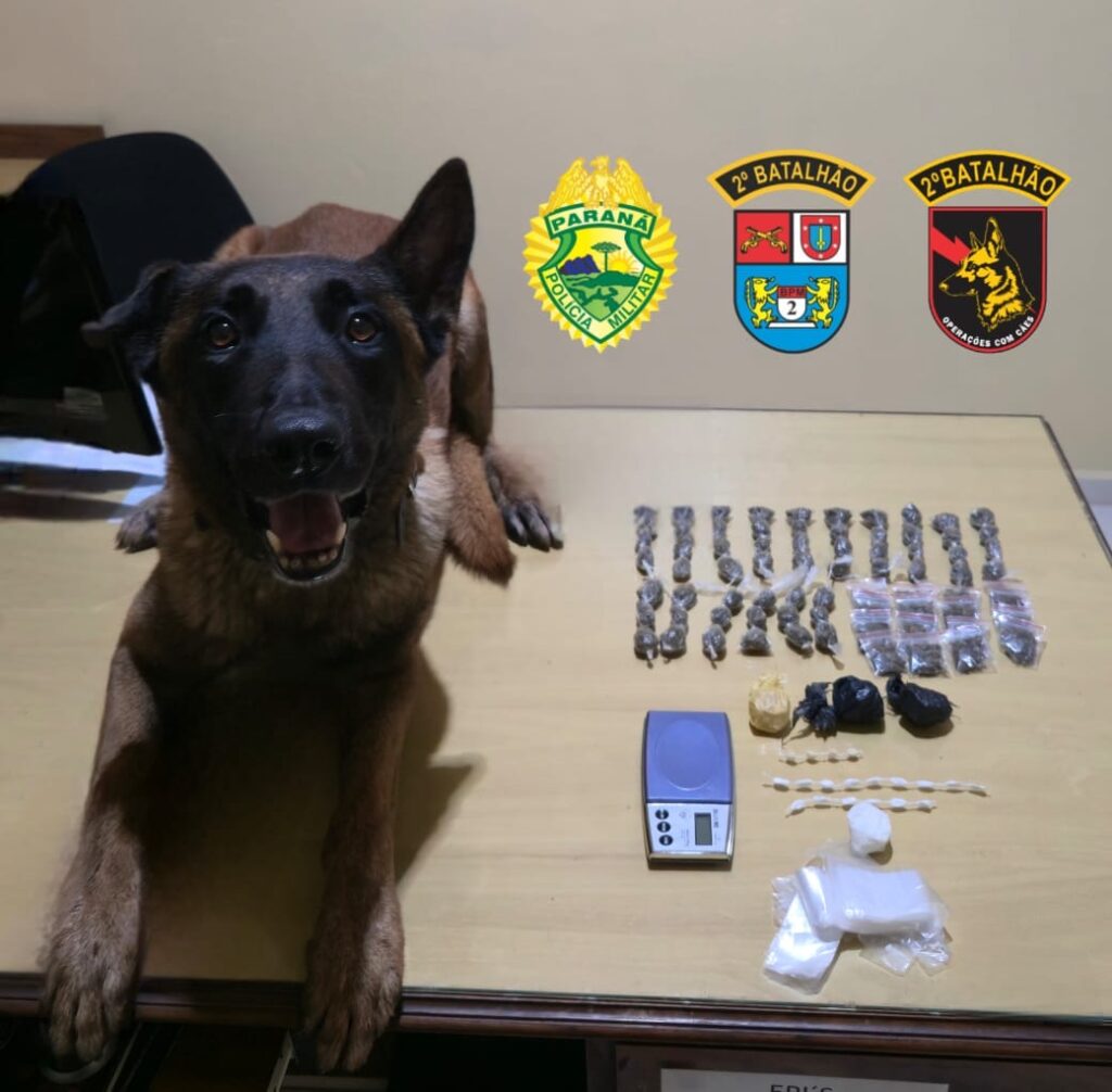 Com o apoio de outras equipes e do Canil da Polícia Militar, as buscas foram intensificadas tanto no terreno quanto no trajeto percorrido durante a fuga. Com o auxílio de um cão farejador, foram localizadas porções de maconha, crack e cocaína escondidas em diferentes pontos, incluindo dentro da motocicleta, em móveis abandonados e enterradas no solo.