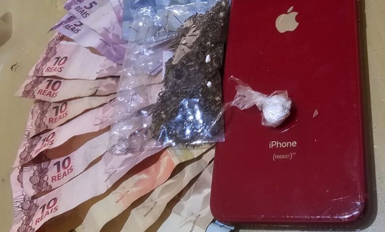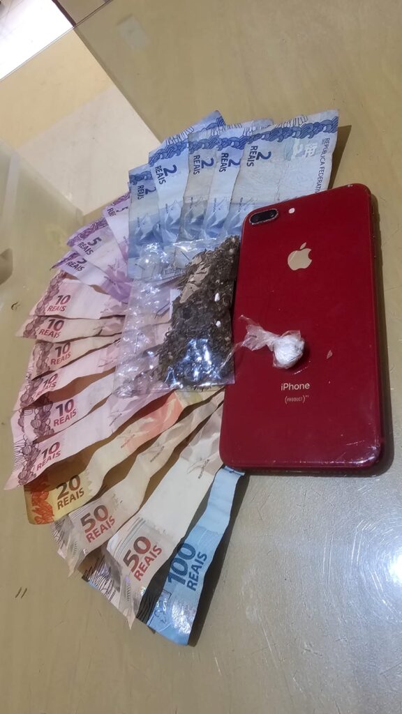 Durante as buscas no interior do imóvel, realizadas com o apoio de um cão farejador, os policiais localizaram uma pequena porção de substância análoga à cocaína, além de uma quantidade de maconha acondicionada em embalagem plástica. No local também foram encontrados dinheiro em espécie, em notas diversas, e materiais comumente utilizados para o acondicionamento de entorpecentes.