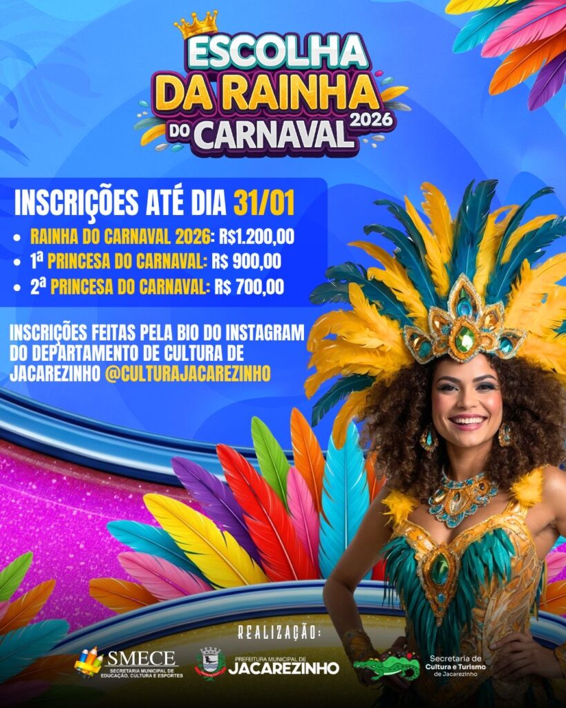 A Prefeitura de Jacarezinho informa que as inscrições para a Escolha da Rainha do Carnaval 2026 foram prorrogadas até o dia 31 de janeiro. É a oportunidade para quem deseja representar a alegria, a beleza e a tradição do carnaval jacarezinhense.