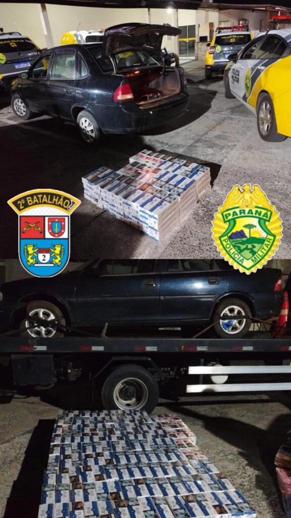 Durante as diligências, um dos veículos foi localizado entrando em Conselheiro Mairinck e abordado na Rua Pedro Sebastião. Na revista veicular, os policiais encontraram 135 pacotes de cigarros de procedência paraguaia, de marcas conhecidas no comércio ilegal.