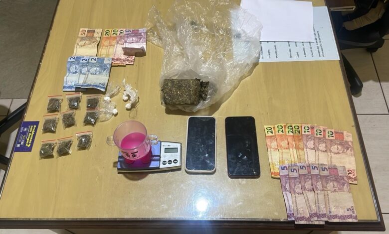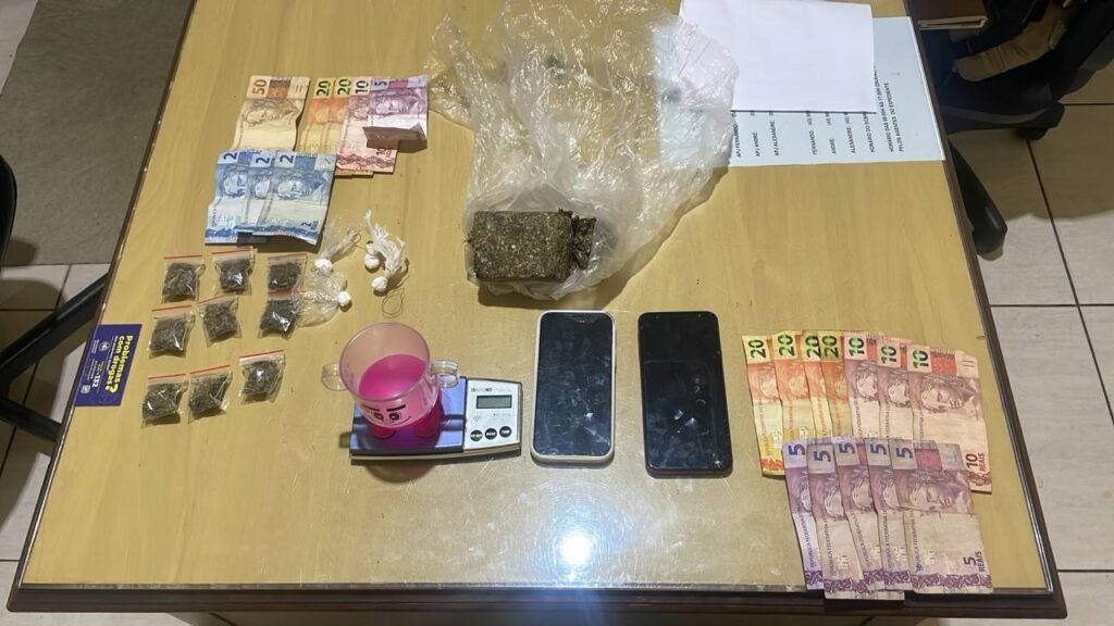 Na revista pessoal, os policiais encontraram diversas porções de substâncias análogas à cocaína e à maconha com os abordados, além de dinheiro em espécie e um aparelho celular. As drogas estavam fracionadas e distribuídas nos bolsos das vestimentas, o que, segundo a Polícia Militar, caracteriza indícios de tráfico.