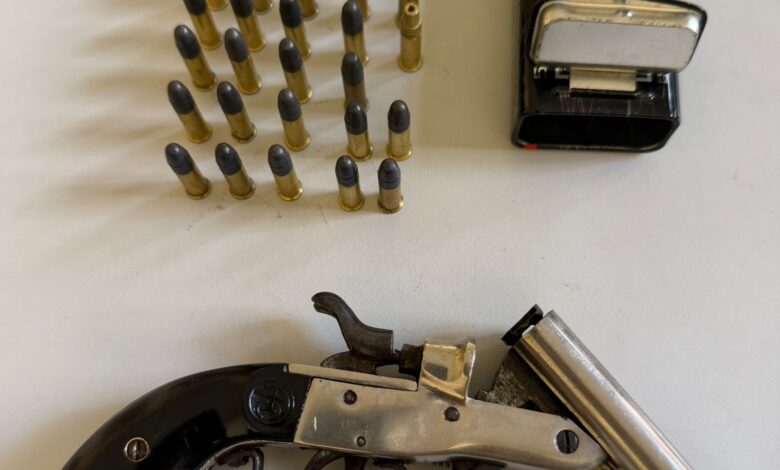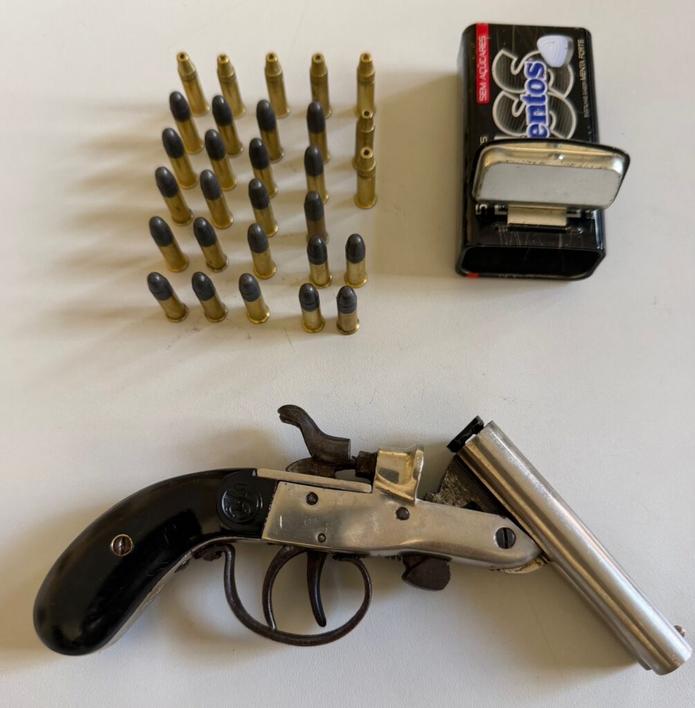 Diante da gravidade dos fatos, os policiais realizaram a abordagem do suspeito e deram voz de prisão. Durante buscas na residência, foi localizada uma arma de fogo do tipo garrucha, calibre .22, além de 29 munições intactas do mesmo calibre, que estavam sobre um guarda-roupa.