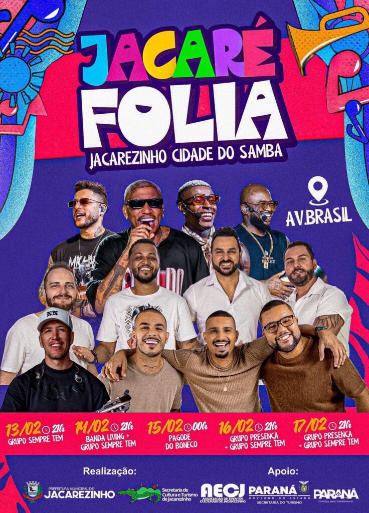 Jacaré Folia 2026, uma realização da Prefeitura Municipal de Jacarezinho, por meio da Secretaria Municipal de Cultura e Turismo, com apoio do Governo do Estado do Paraná, por meio da Secretaria de Turismo – SETU.