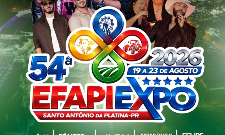 SANTO ANTÔNIO DA PLATINA (PR) — A organização da 54ª EFAPI EXPO divulgou oficialmente a programação de shows da edição 2026, que acontecerá entre os dias 19 e 23 de agosto, no Parque de Exposições de Santo Antônio da Platina.