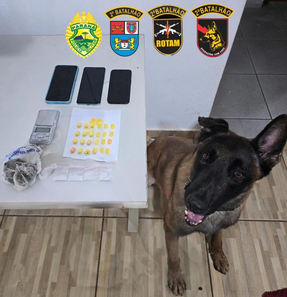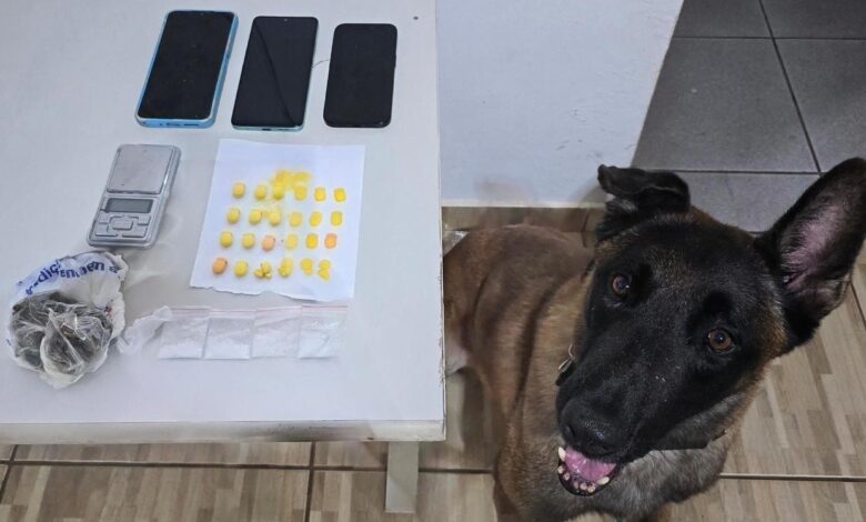 Com apoio de um cão de detecção, foi realizada busca minuciosa no local, que indicou positivamente uma mochila localizada na cozinha. No interior foram encontradas porções de maconha, cocaína e comprimidos de MDMA, além de uma balança de precisão e materiais utilizados para embalar drogas, indicando possível fracionamento para comercialização.