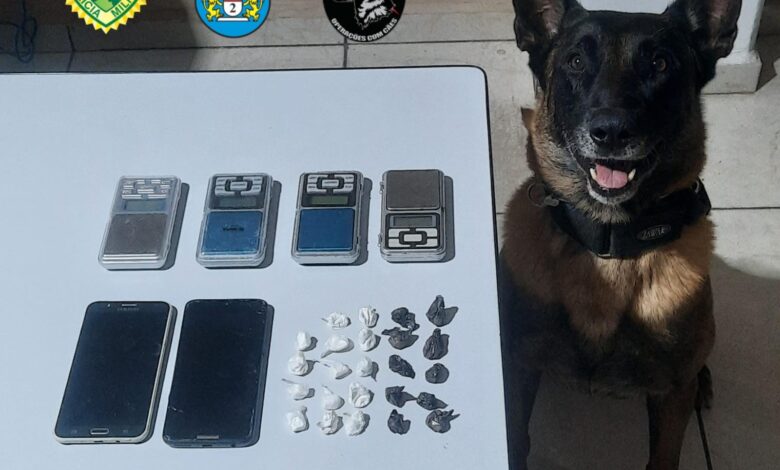 No interior do imóvel, um homem foi abordado. Com apoio do cão de detecção K9 Thor, foram realizadas buscas na casa. O animal indicou a presença de substância suspeita no madeiramento do telhado. No ponto indicado, os policiais localizaram um invólucro plástico contendo 24 porções de substância análoga à cocaína, já fracionadas e embaladas para comercialização, totalizando aproximadamente 20 gramas.