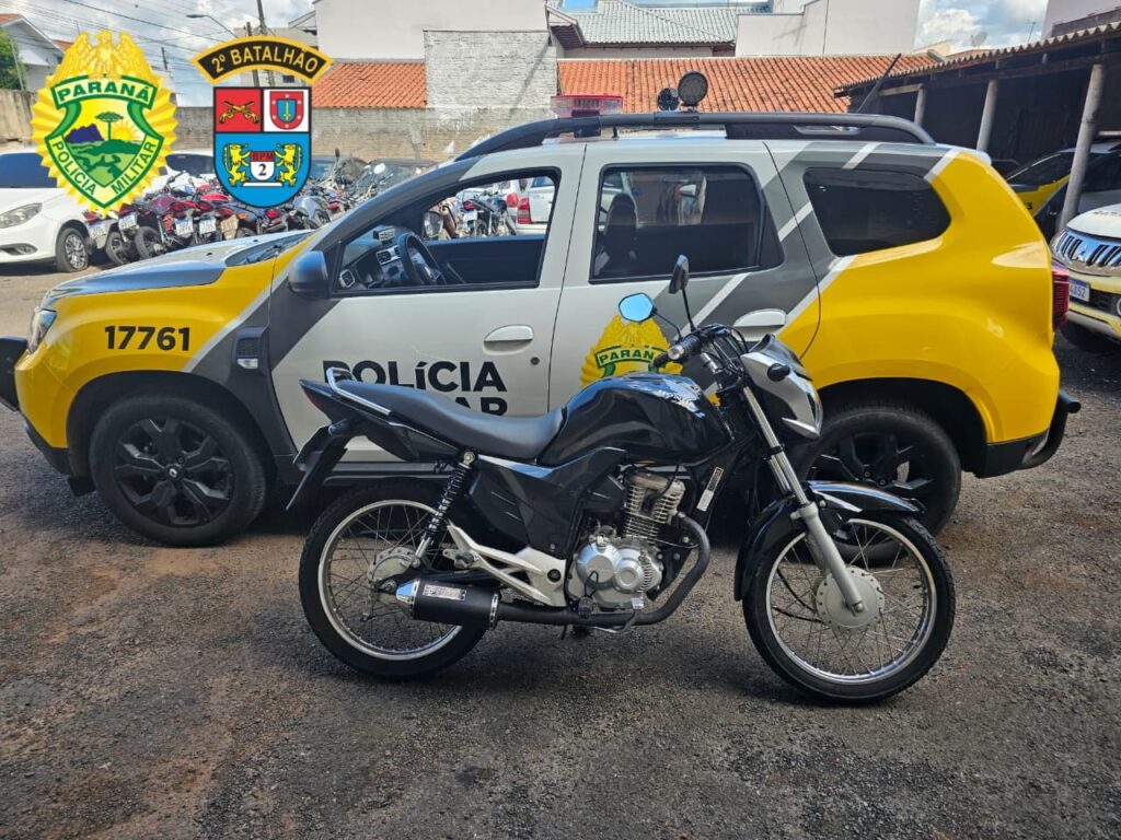SANTO ANTÔNIO DA PLATINA – Uma motocicleta foi apreendida na tarde desta terça-feira (24) após um acompanhamento tático realizado por equipes do 2º Batalhão da Polícia Militar na área central do município.