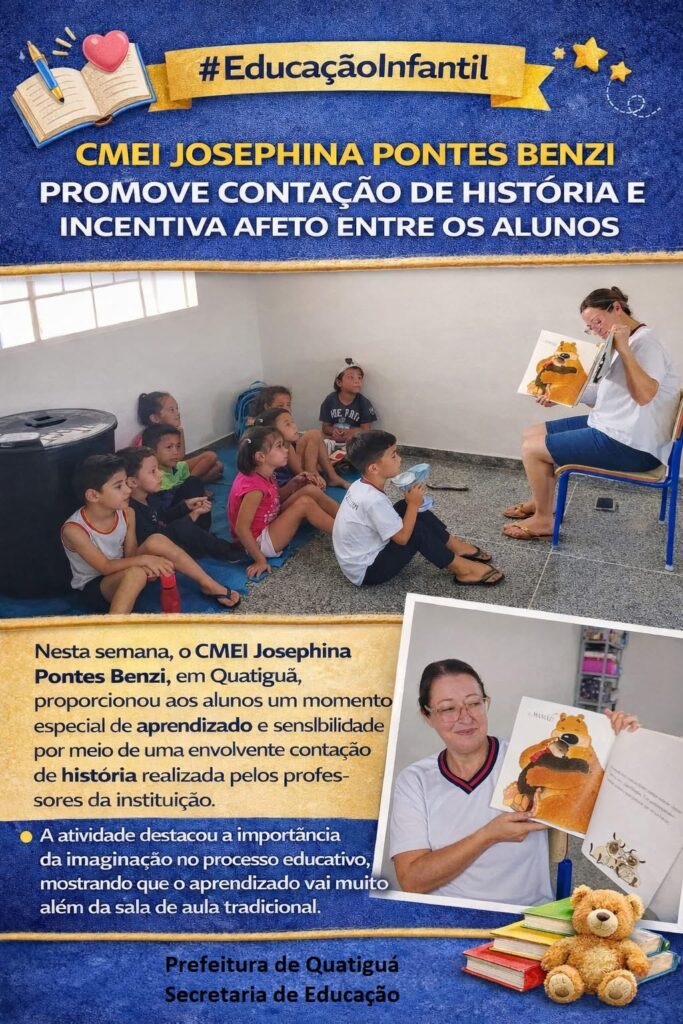O CMEI Josephina Pontes Benzi, em Quatiguá, realizou nesta semana uma atividade especial de contação de história com os alunos da Educação Infantil. A iniciativa proporcionou um momento de aprendizado lúdico e de fortalecimento dos vínculos afetivos dentro do ambiente escolar.