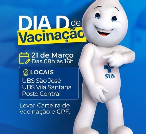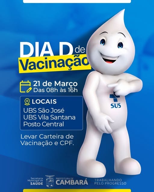 A Prefeitura de Cambará realiza, no dia 21 de março, o Dia D de Vacinação, das 08h às 16h, nas unidades de saúde do município.