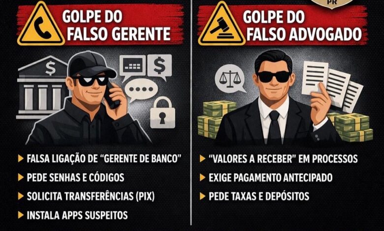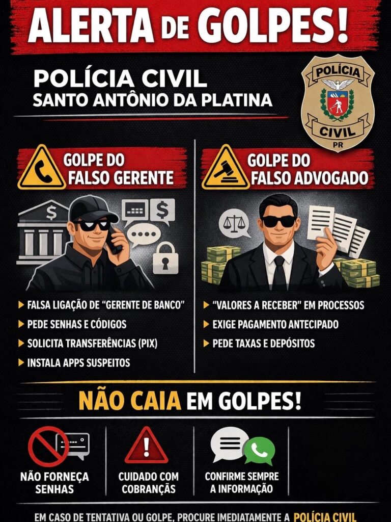 SANTO ANTÔNIO DA PLATINA – A Polícia Civil do Paraná emitiu um alerta à população sobre dois tipos de golpes que vêm sendo registrados com frequência na região: o golpe do falso gerente de banco e o golpe do falso advogado.