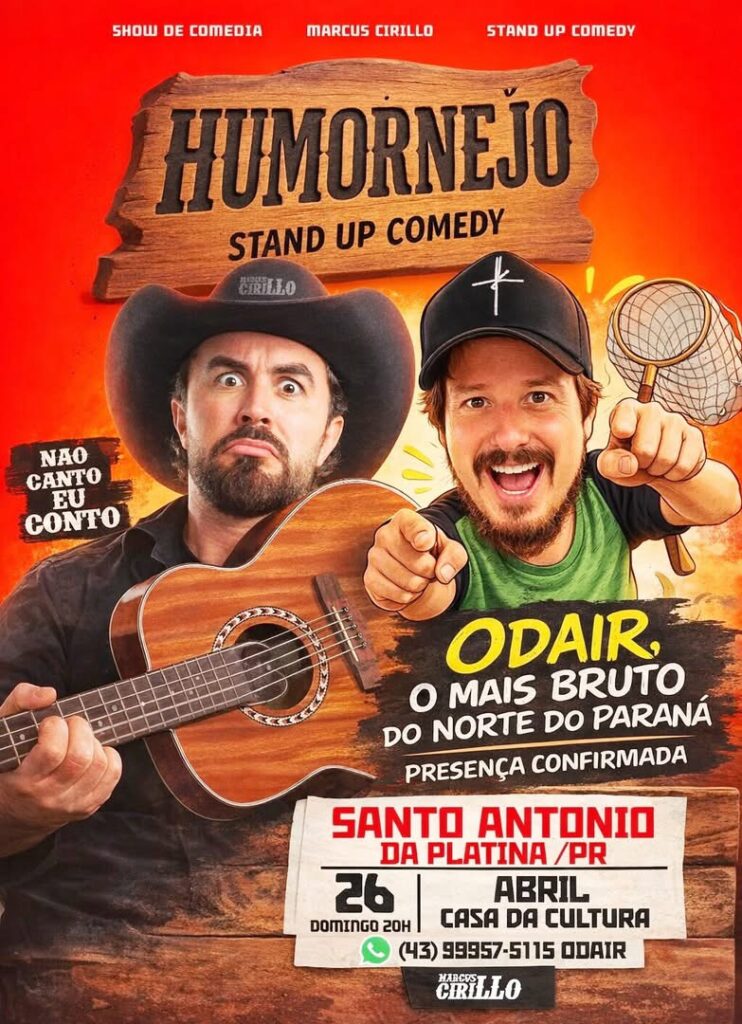 Já no dia 26 de abril (domingo), às 20h, o humor toma conta com o show “Humornejo – Stand Up Comedy”, do comediante Marcus Cirillo, com participação confirmada de Odair, conhecido como “o mais bruto do Norte do Paraná”. O espetáculo será realizado na Casa da Cultura e promete arrancar boas risadas do público com um estilo irreverente que mistura comédia e referências sertanejas.