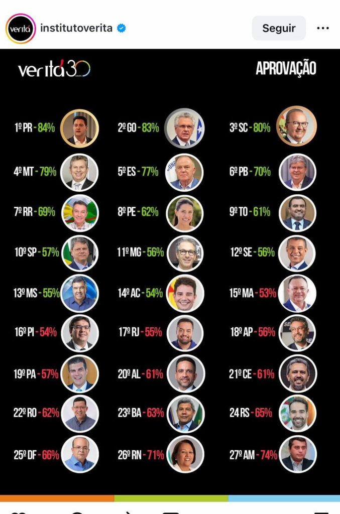 O ranking ainda mostra nomes como Mauro Mendes (79%), Renato Casagrande (77%) e João Azevêdo (70%) entre os mais bem avaliados do País.