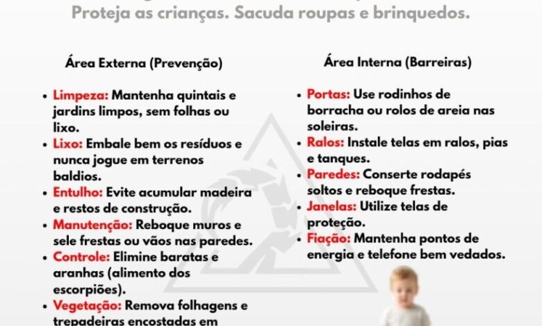 Baseadas no Manual de Controle do Ministério da Saúde, estas medidas são as armas mais potentes contra o escorpião e o mosquito Aedes aegypti.